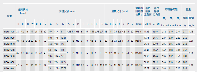 上銀導軌HGW30CC滑塊其它數(shù)據(jù)如下: