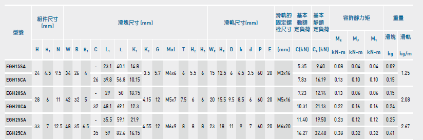 上銀滑塊EGH25SA參數(shù)如下: