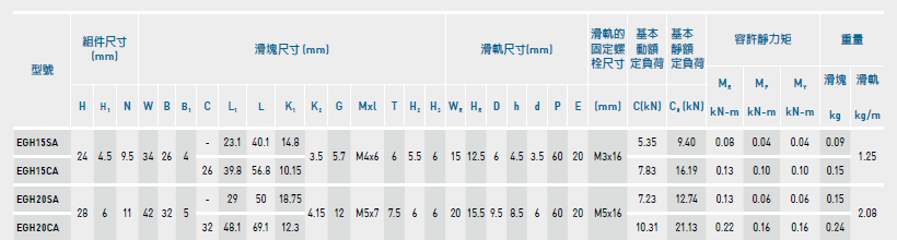 上銀導軌EGH20CA滑塊尺寸參數(shù)如下: